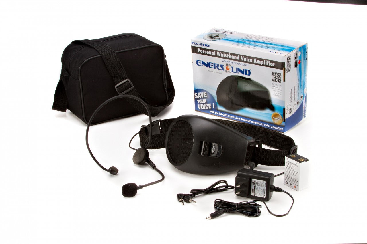 The Enersound PA-200 is a state-of-the-art personal waistband voice amplifier with a sleek modern design. It is hands-free, worn like a belt around the waist and very comfortable. You no longer have to strain your precious voice thanks to the Enersound PA-200 and its powerful 10-watt amplifier. It can be used indoors and outdoors. It is powered by a NiMH rechargeable battery and an intelligent charging circuit that extend the battery life up to 12 hrs per charge for the longest lasting performance of its kind. It features a microphone and an auxiliary input to connect to an MP3/CD player that allows playing of pre-recorded presentations. This system comes with a high-quality headband microphone, a charging power adapter, a sturdy waist band and a 3.5 mm plug auxiliary cable. The PA-200 voice amplifier comes in black and white and other colors are available for special orders. The PA-200 personal waistband amplifier is ideal for teaching, guided tours, meetings, entertainment, corporate training, coaching, fitness, public speaking, kids camps, sales presentations, classrooms, meeting rooms, houses of worship, tour groups, fitness centers, kids’ camps, sales presentations, trade shows, auctions, as well as for many other applications where voice amplification is needed.