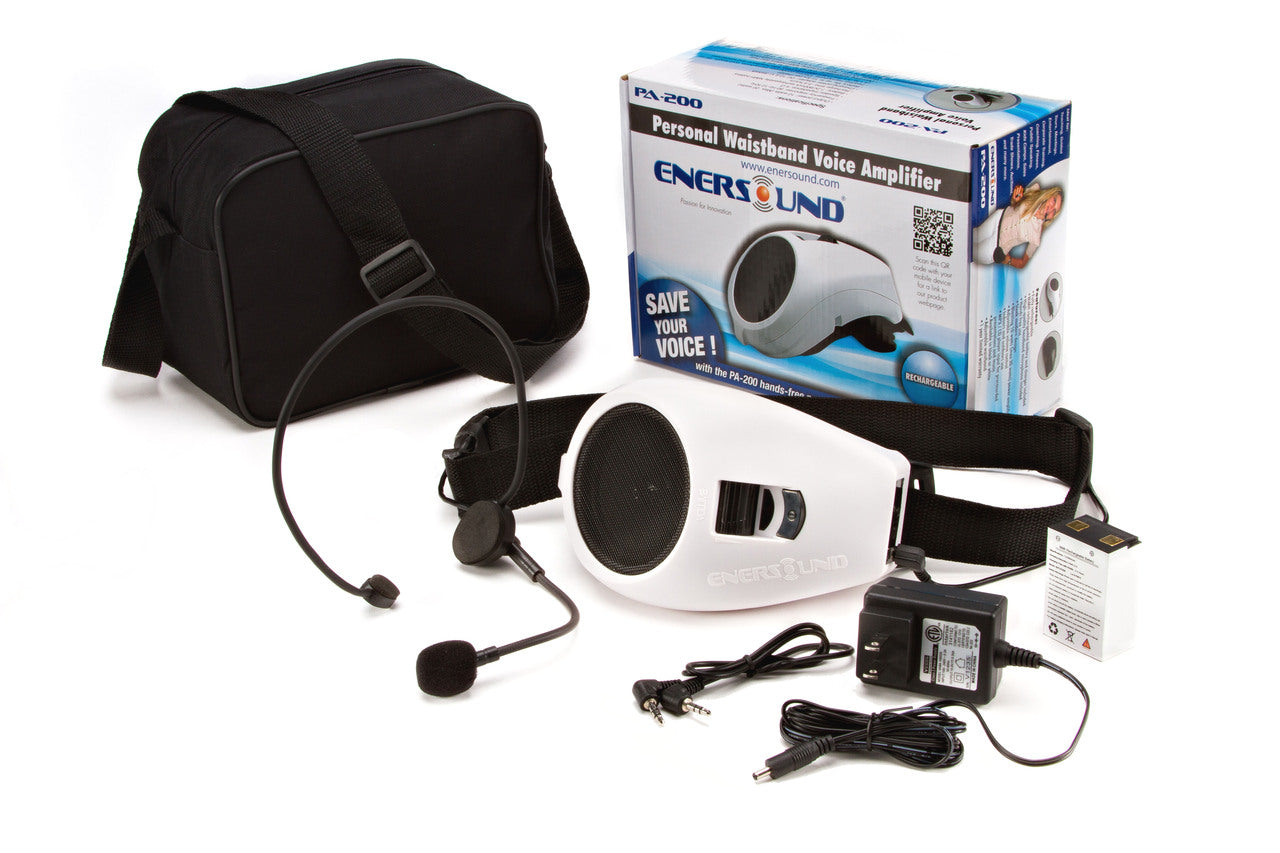 The Enersound PA-200 is a state-of-the-art personal waistband voice amplifier with a sleek modern design. It is hands-free, worn like a belt around the waist and very comfortable. You no longer have to strain your precious voice thanks to the Enersound PA-200 and its powerful 10-watt amplifier. It can be used indoors and outdoors. It is powered by a NiMH rechargeable battery and an intelligent charging circuit that extend the battery life up to 12 hrs per charge for the longest lasting performance of its kind. It features a microphone and an auxiliary input to connect to an MP3/CD player that allows playing of pre-recorded presentations. This system comes with a high-quality headband microphone, a charging power adapter, a sturdy waist band and a 3.5 mm plug auxiliary cable. The PA-200 voice amplifier comes in black and white and other colors are available for special orders. The PA-200 personal waistband amplifier is ideal for teaching, guided tours, meetings, entertainment, corporate training, coaching, fitness, public speaking, kids camps, sales presentations, classrooms, meeting rooms, houses of worship, tour groups, fitness centers, kids’ camps, sales presentations, trade shows, auctions, as well as for many other applications where voice amplification is needed.