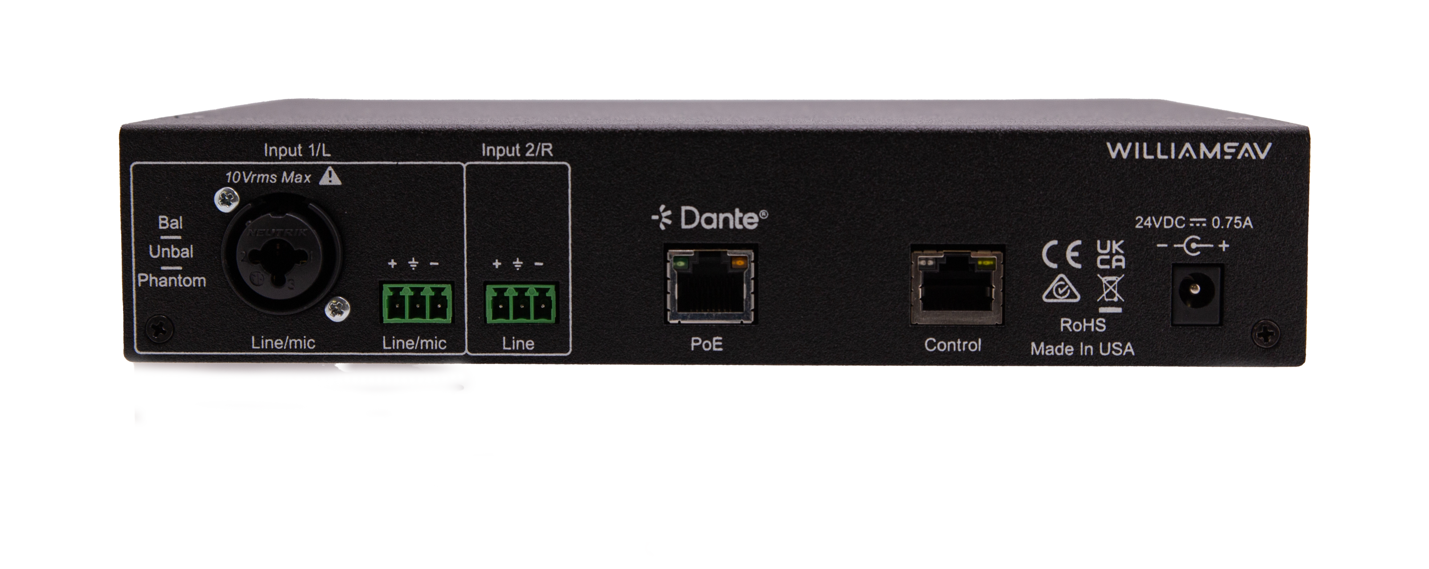 - Pro AV Controller – Rack-mount ready with analog and Dante® inputs; configure and monitor via front panel or web interface.